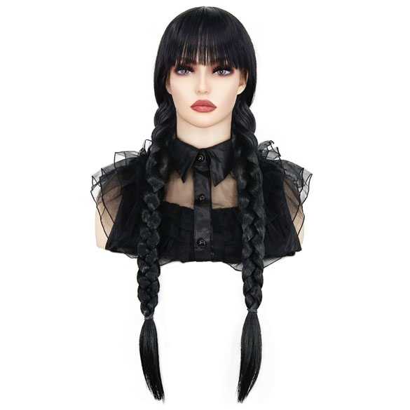 € 39,95Wednesday Addams pruik met twee lange vlechten. Scheiding met stukje huidimitatie. Model met pony.