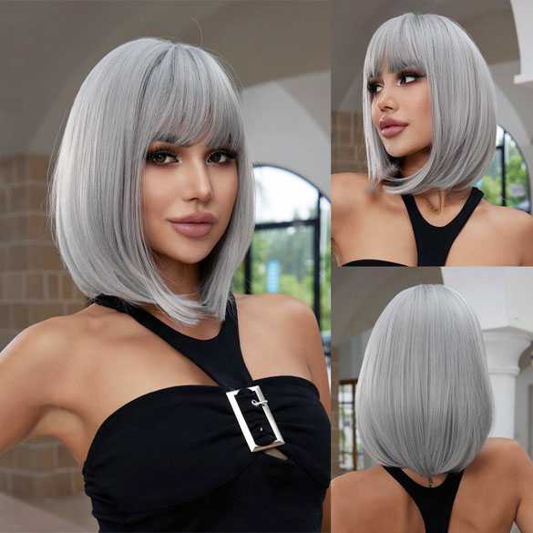 Lichtgrijze pruik bob model met steil haar op schouderlengte