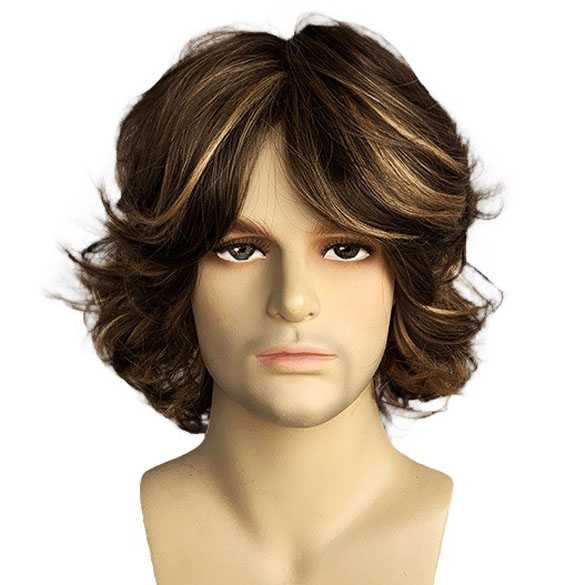 € 37,95Mannenpruik halflang krullend haar in laagjes. Model met pony. Goudgele highlights.