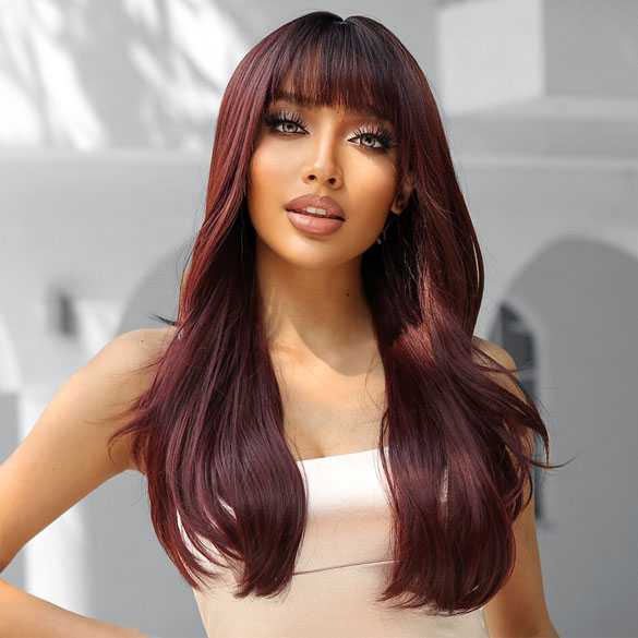 Mooie pruik wijnrood met grove slag in laagjes. Model met pony en zwarte roots. Scheiding met huidimitatie.