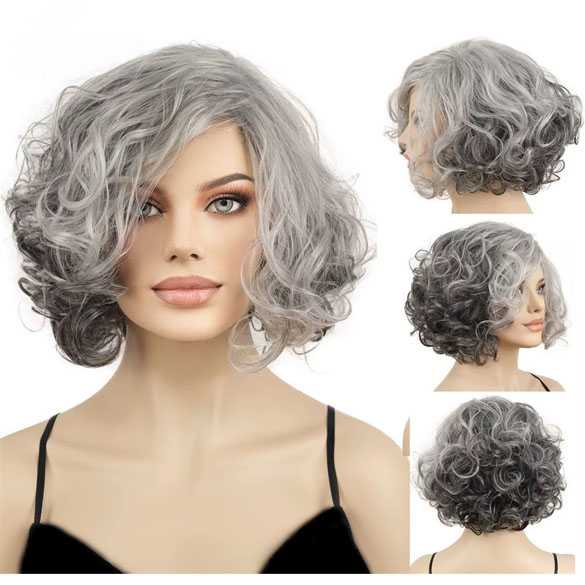 Mooie nonchalante pruik met krullen licht en donkergrijs mix