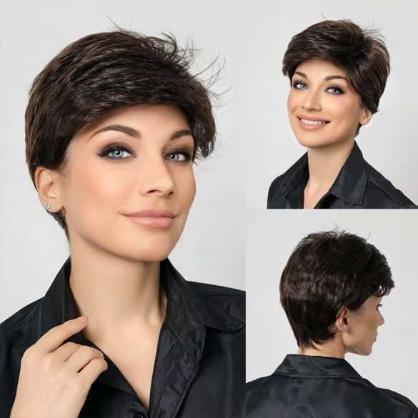 Damespruik kort steil zakelijk pixie kapsel in laagjes medium bruin