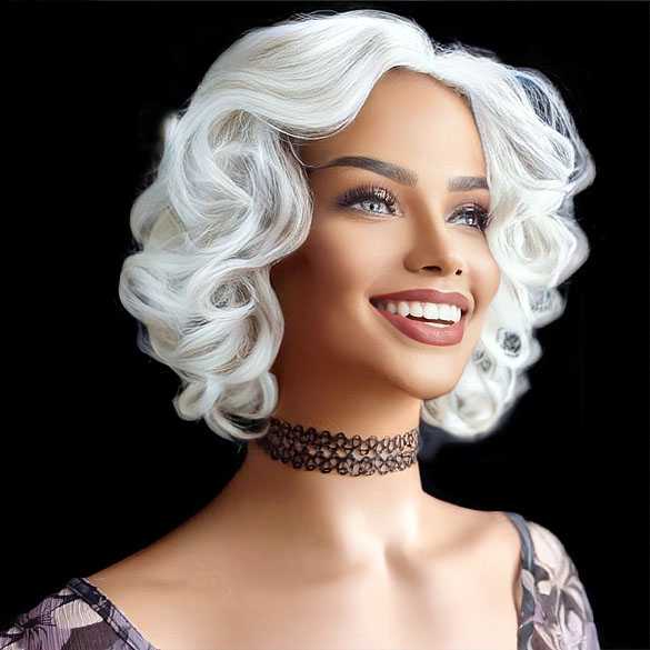 Andere kleur? » klik hierPruik kort model met krullen en volume. Scheiding met stukje huidimitatie. Model zonder pony. Ook voor drag / travestie / foto-shoot / Marilyn Monroe style.